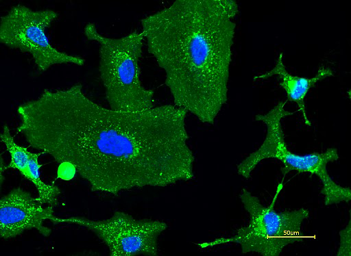 图1. 将HeLa活细胞用5 µg/mL 的AF488小麦胚芽凝集素(WGA)探针(#25500)染色 30 分钟,再用 Hoechst 333429(#17535)染色。使用 FITC 和 DAPI 滤光片组在荧光显微镜获取图像。