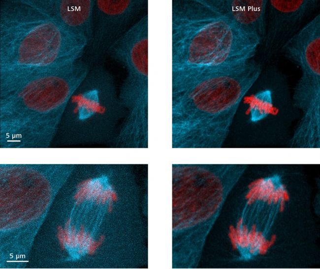 LLC-PK1 分裂细胞(猪肾)的实时成像,表达为H2B-mCherry(红色)和α- 微管蛋白-mEGFP(青色)。未使用LSM Plus(左)和使用LSM Plus(右)的比较。