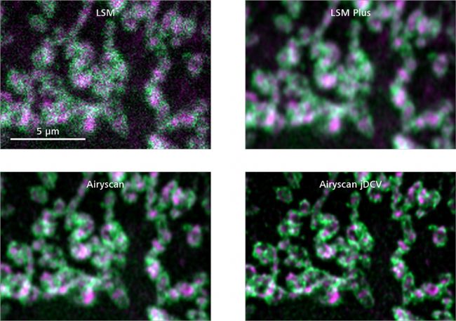 Cos7细胞,对损伤线粒体外膜蛋白Tom20( 绿色)和线粒体内膜蛋白ATP5a(品红色)染色,Airyscan jDCV(右下)能更好地解析内外膜结构。样品由中国科技大学的Zhang Y 提供。