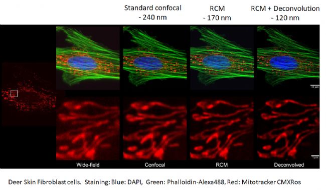 鹿皮肤成纤维细胞样本,从左到右分别是:大视野图片、放大的宽场图片、传统共聚焦图片、 RCM技术处理的图片、 Deconvolution(去卷积)处理的图片。可见 RCM 和“去卷积”技术都可以得到比传统共聚焦技术更好的分辨率和灵敏度。