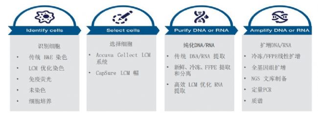 图3. LCM的实验流程。根据微基因组学工作流程所需的样本类型和应用,我们提供各种试剂盒,以便您实施从细胞识别与选择到RNA和 DNA分离与纯化的诸多步骤。