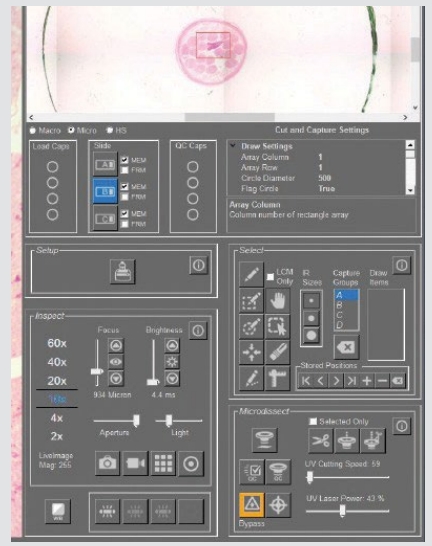 仪器随附的Laxco Accuva Cellect 软件简化了LCM工作流程。只需点击鼠标,即可控制所有系统操作,包括载物台移动、载玻片和物镜选择、聚焦和光强度、激光参数、盖片转移(包括QC确认)和相机设置(图4)。