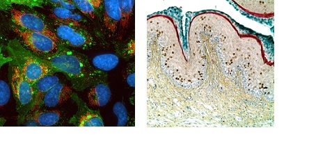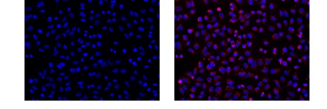 用Image-iT® Hypoxia缺氧指示剂和NucBlue活细胞核染料染A549细胞,暴露于不同氧浓度。左图20% O2条件下,仅呈现蓝色细胞核;右图1% O2条件下,观察到明显红色Hypoxia试剂信号,表明细胞缺氧。