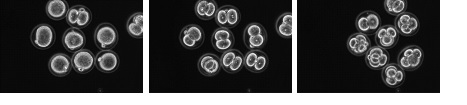 小鼠胚胎细胞分裂,清晰地观察到分裂过程:原核期、2细胞期和4细胞期
